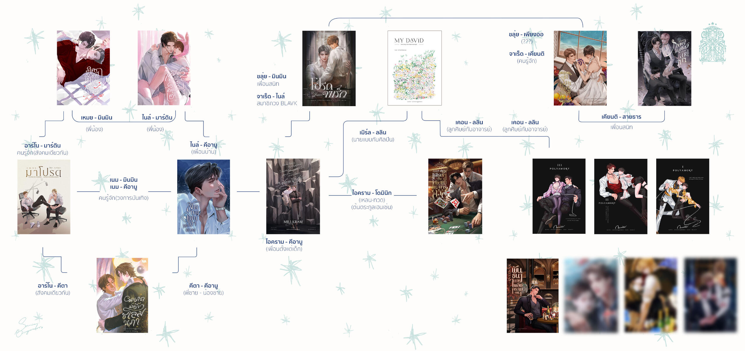 (จักรวาลคุณชาย)นิยายสามารถอ่านแยกได้ทุกเรื่อง แม้ตัวละครแต่ละเรื่องจะรู้จักกันค่ะด้านล่างคือแผนผังความสัมพันธ์